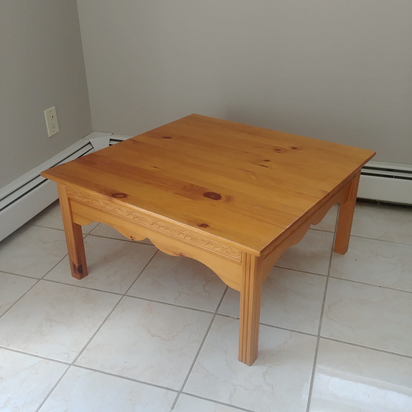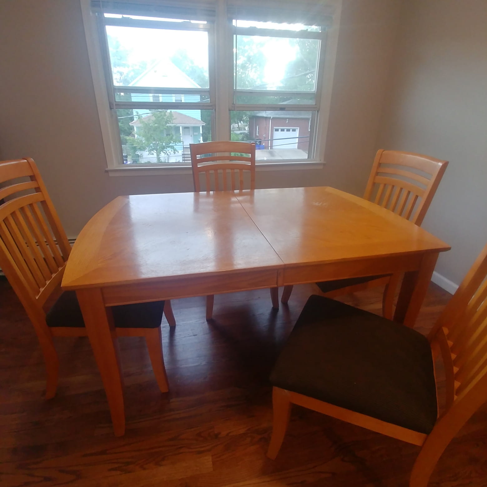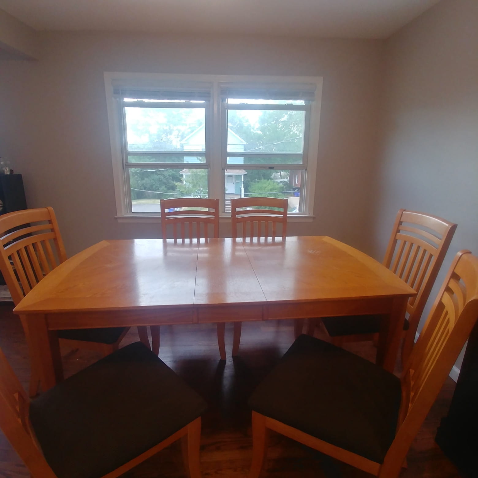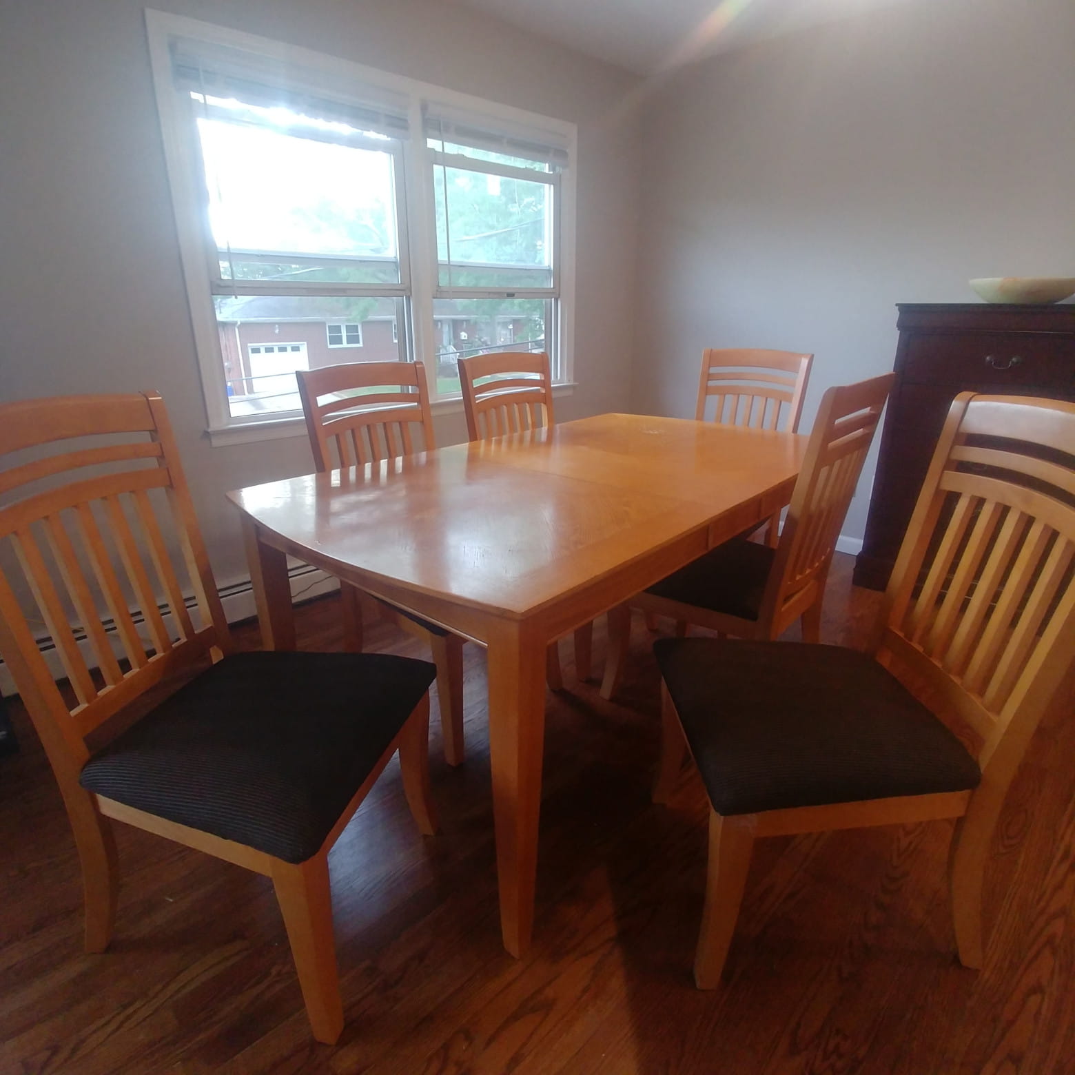 Solid wood dinner table with 6 chairs. The length is adjustable with a removable middle piece.