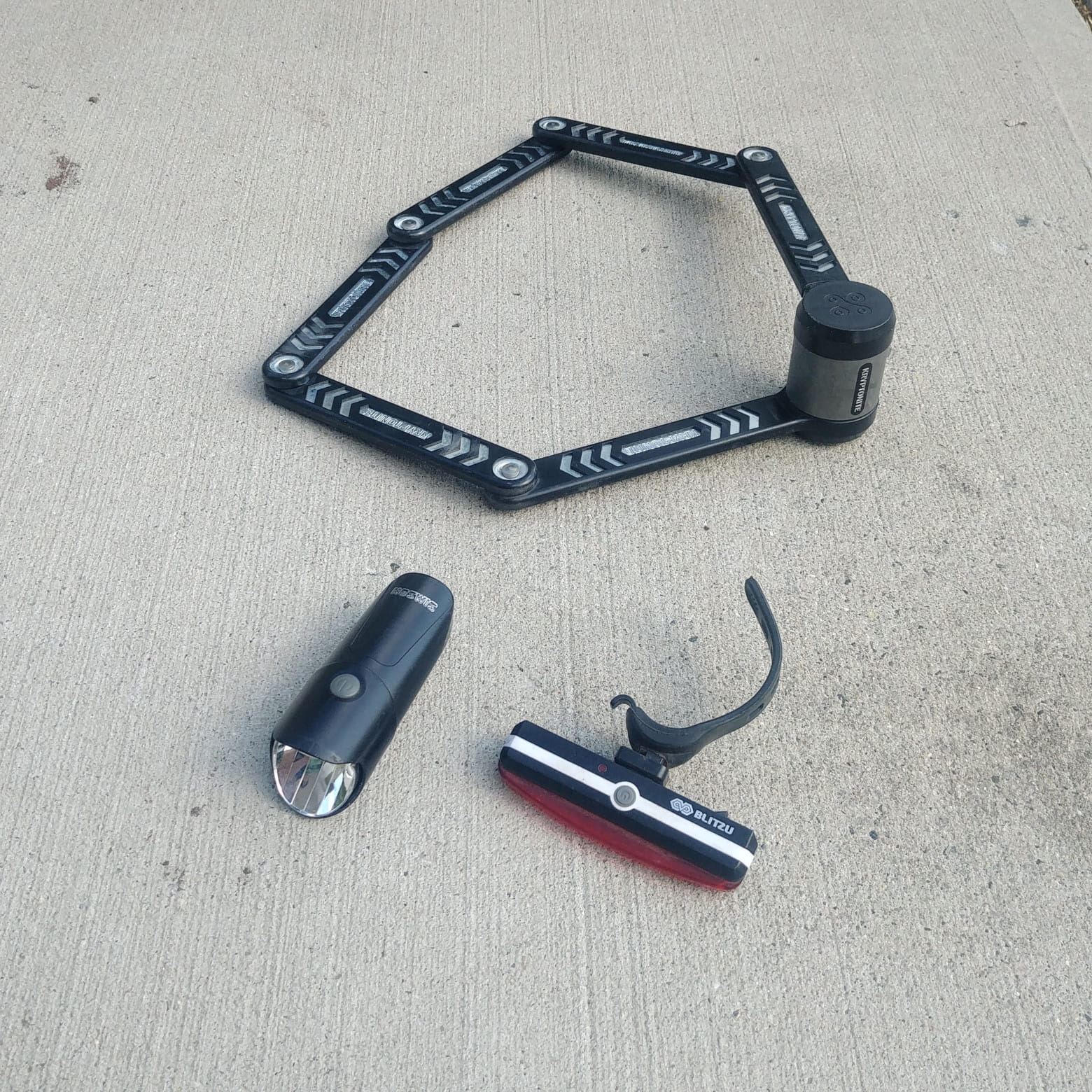 Suitable for smaller people (5ft 2"), includes lock, helmet, lights and rain gear.