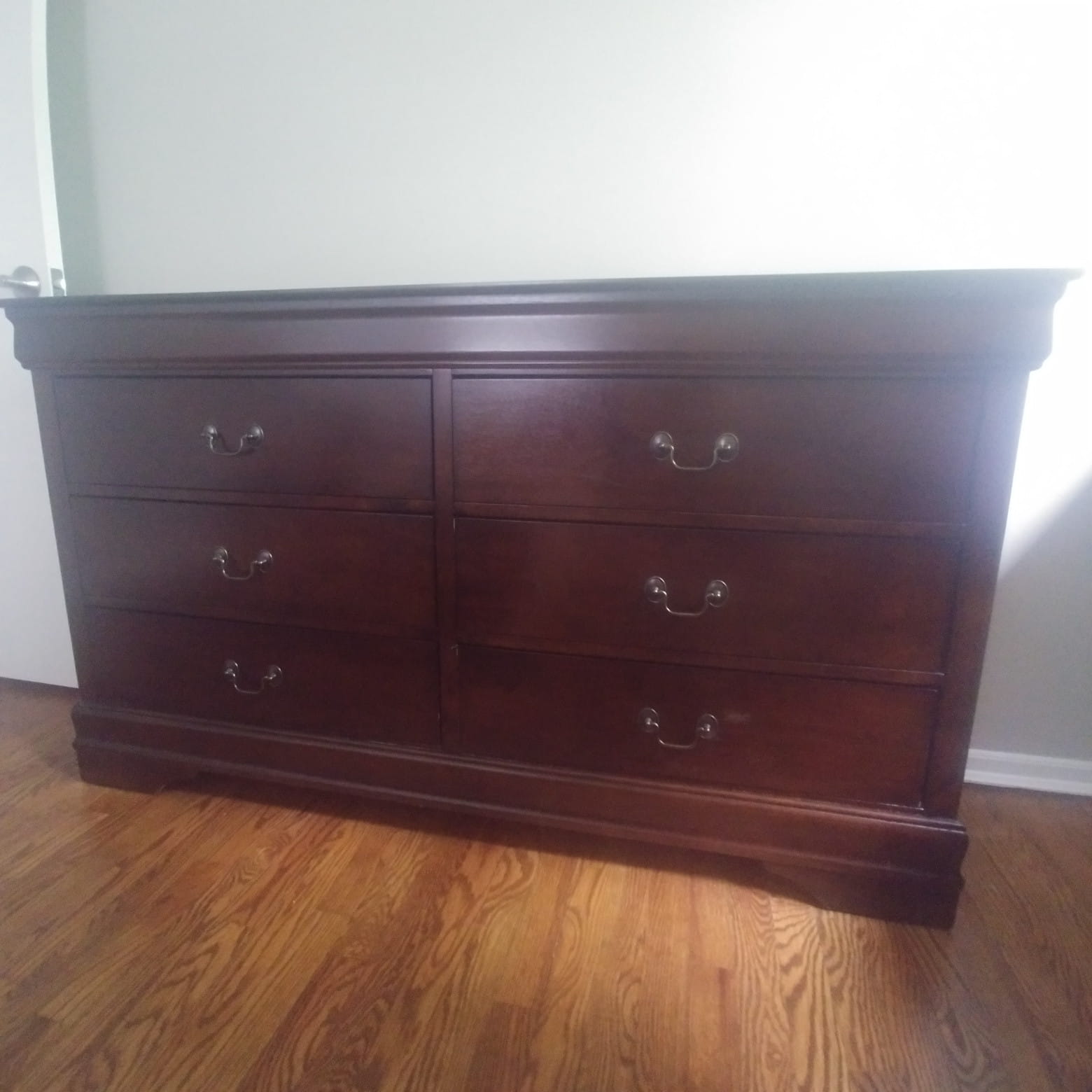 Horizontal dresser with 6 drawers and a mirror that can be mounted on top. Mirror has never been used, is still in original packaging.