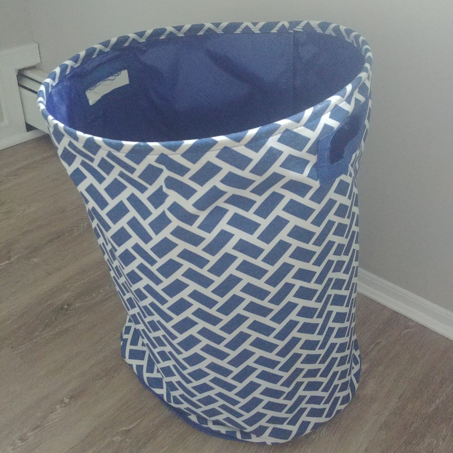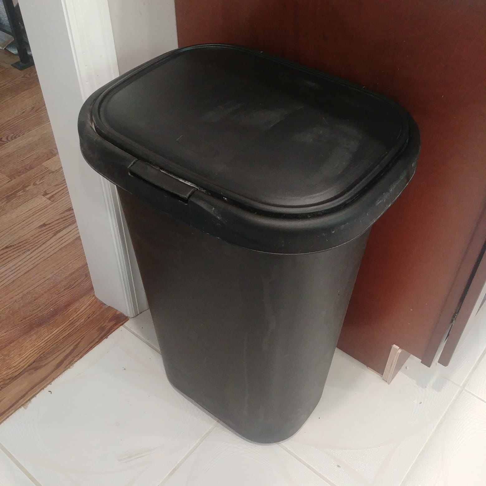 Black 13 gallon trash can with a spring-top lid. available end of June