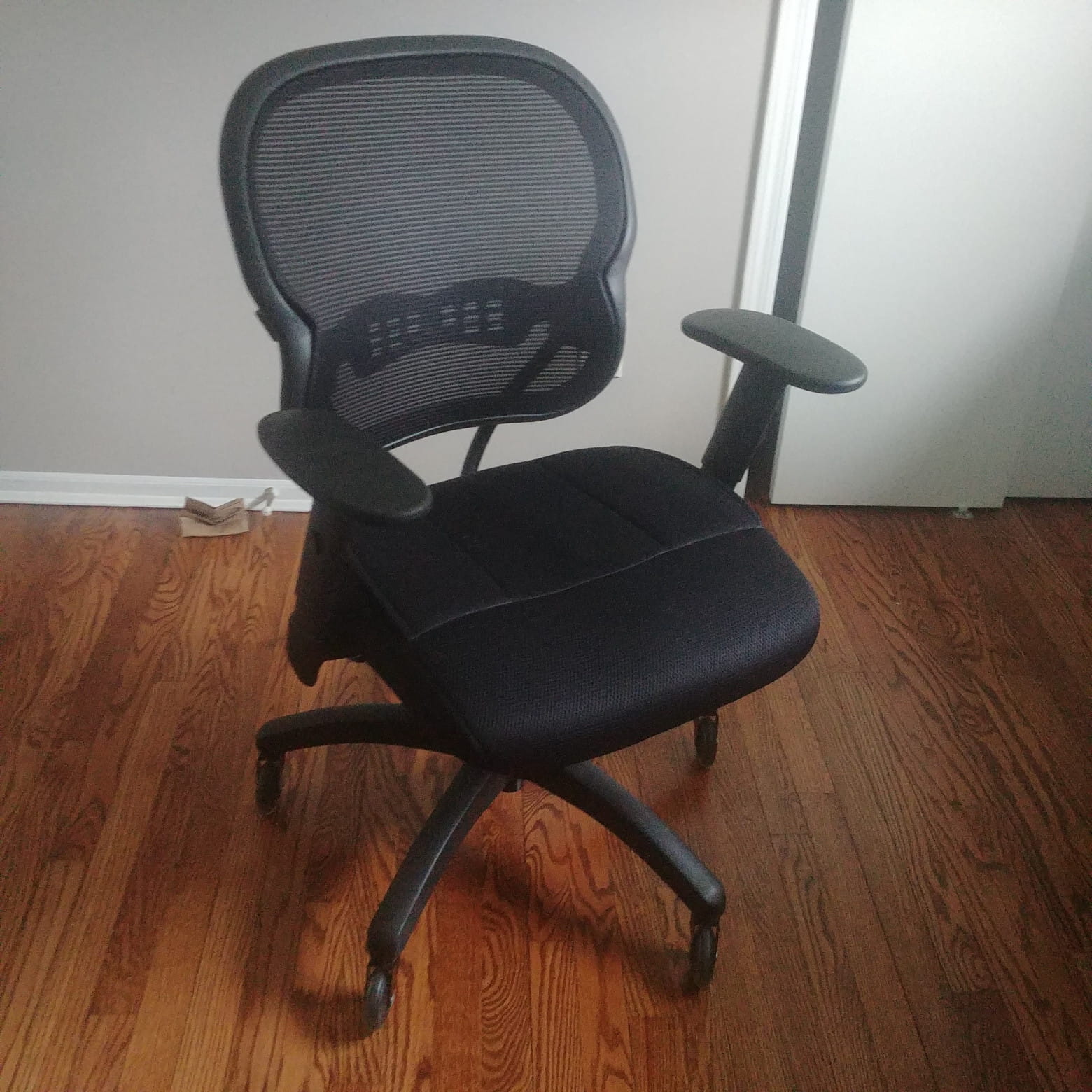 Comfortable office chair with arm rests and lumbar support. Only about a year old. Has rollerblade casters that protect floors and make rolling around easier.