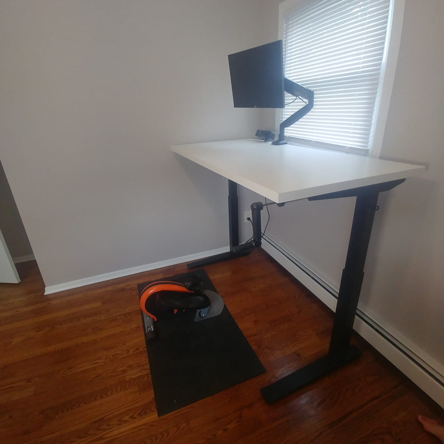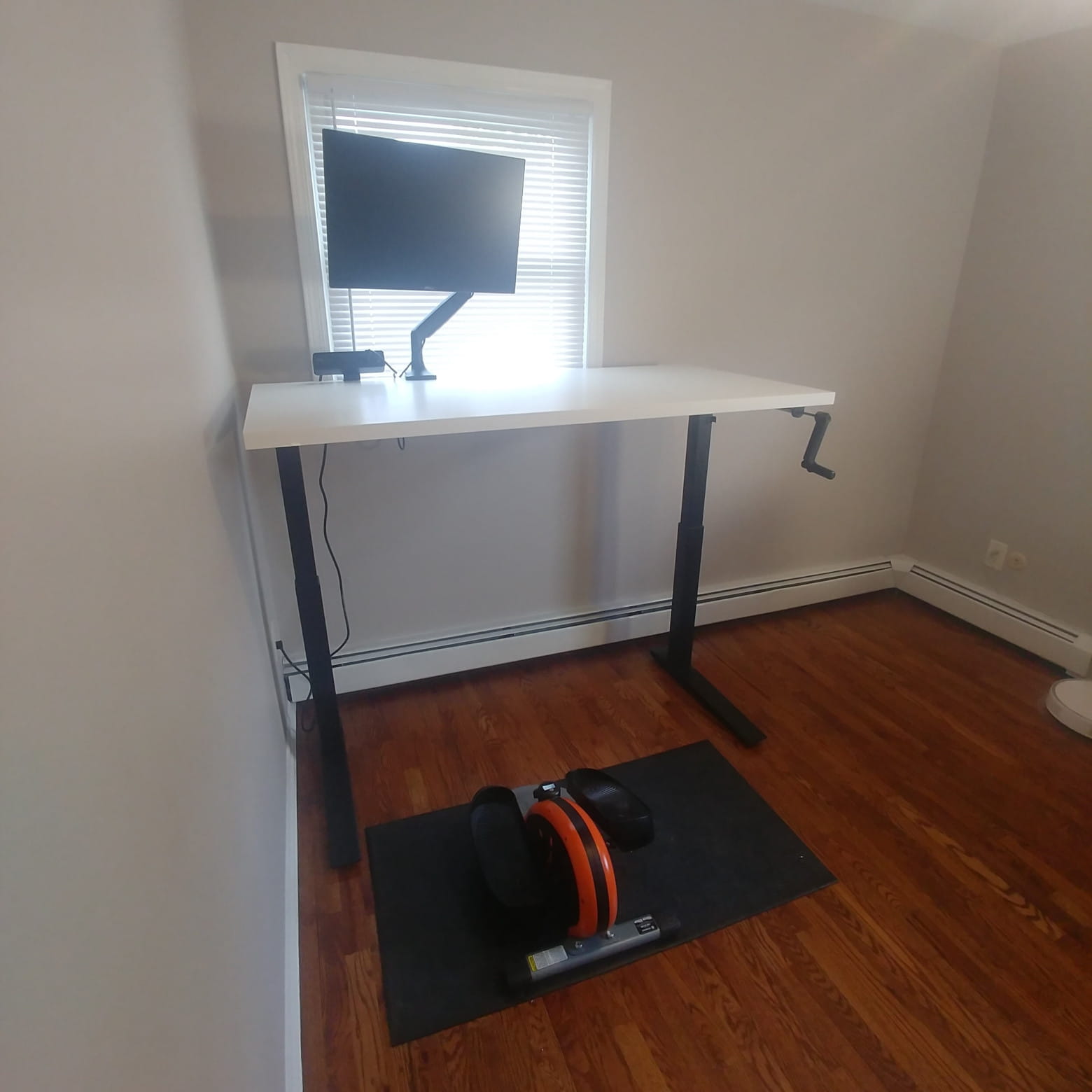 Under desk elliptical stepper that can be used in a sitting or standing position. Including equipment mat to prevent floor damage and make standing at the desk more comfortable.