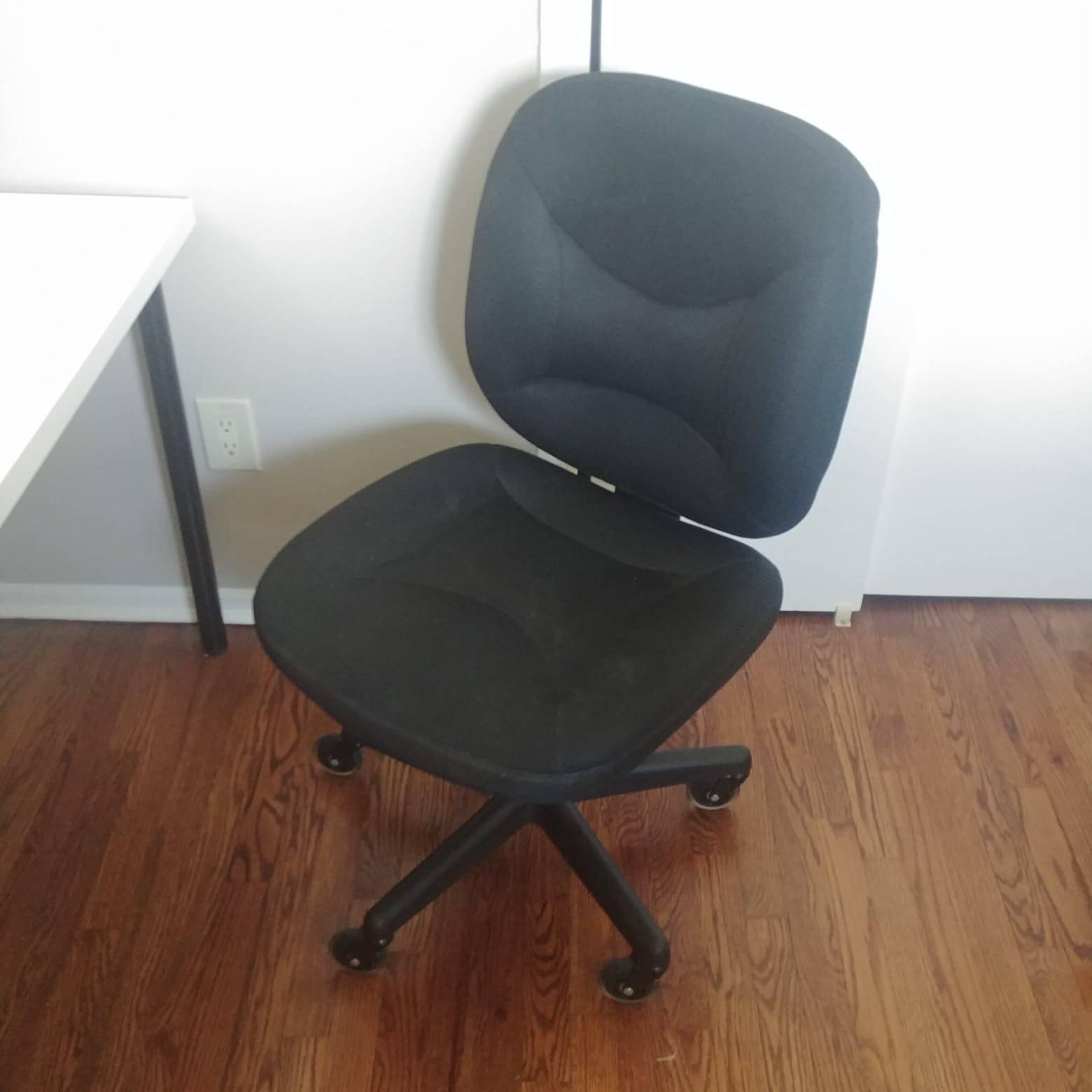 Simple office chair without arm rests. Only about a year old. Has rollerblade casters that protect floors and make rolling around easier.