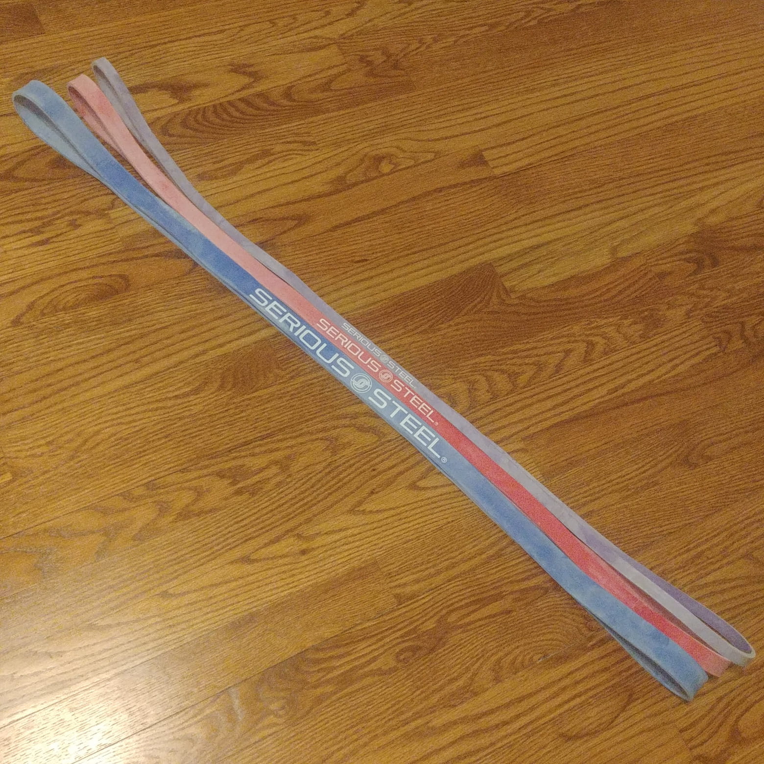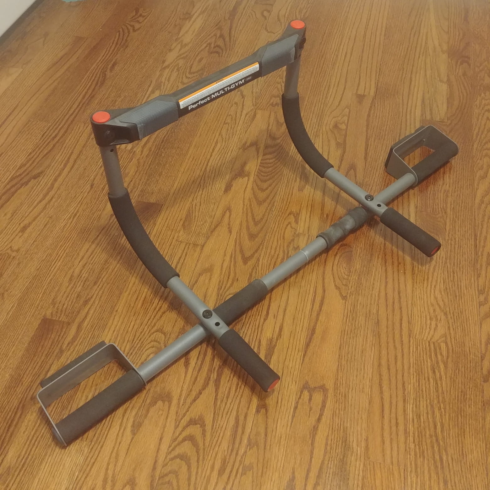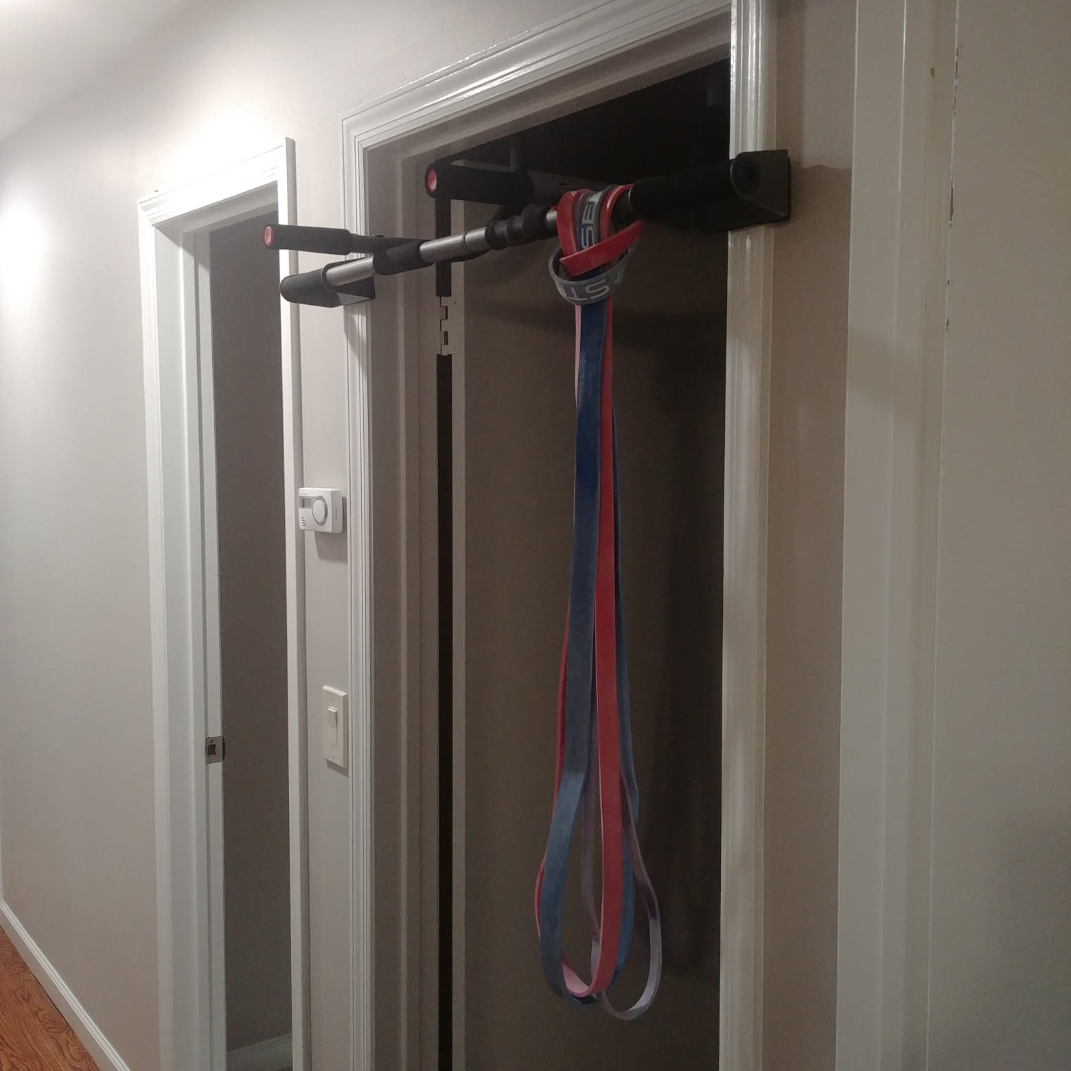 Pull-up bar that mounts on top of a door-frame. Includes pull-up bands to fine-tune training.