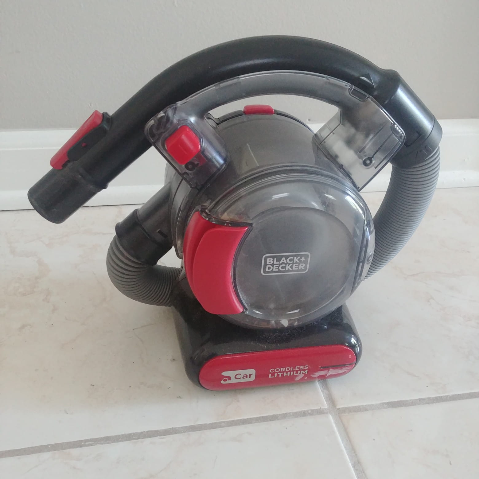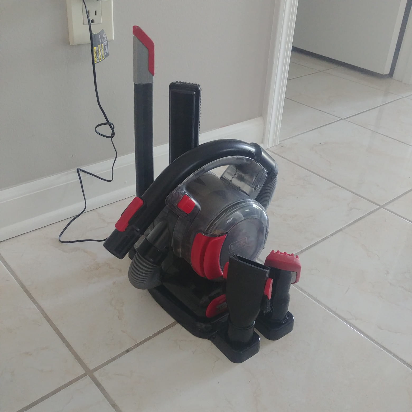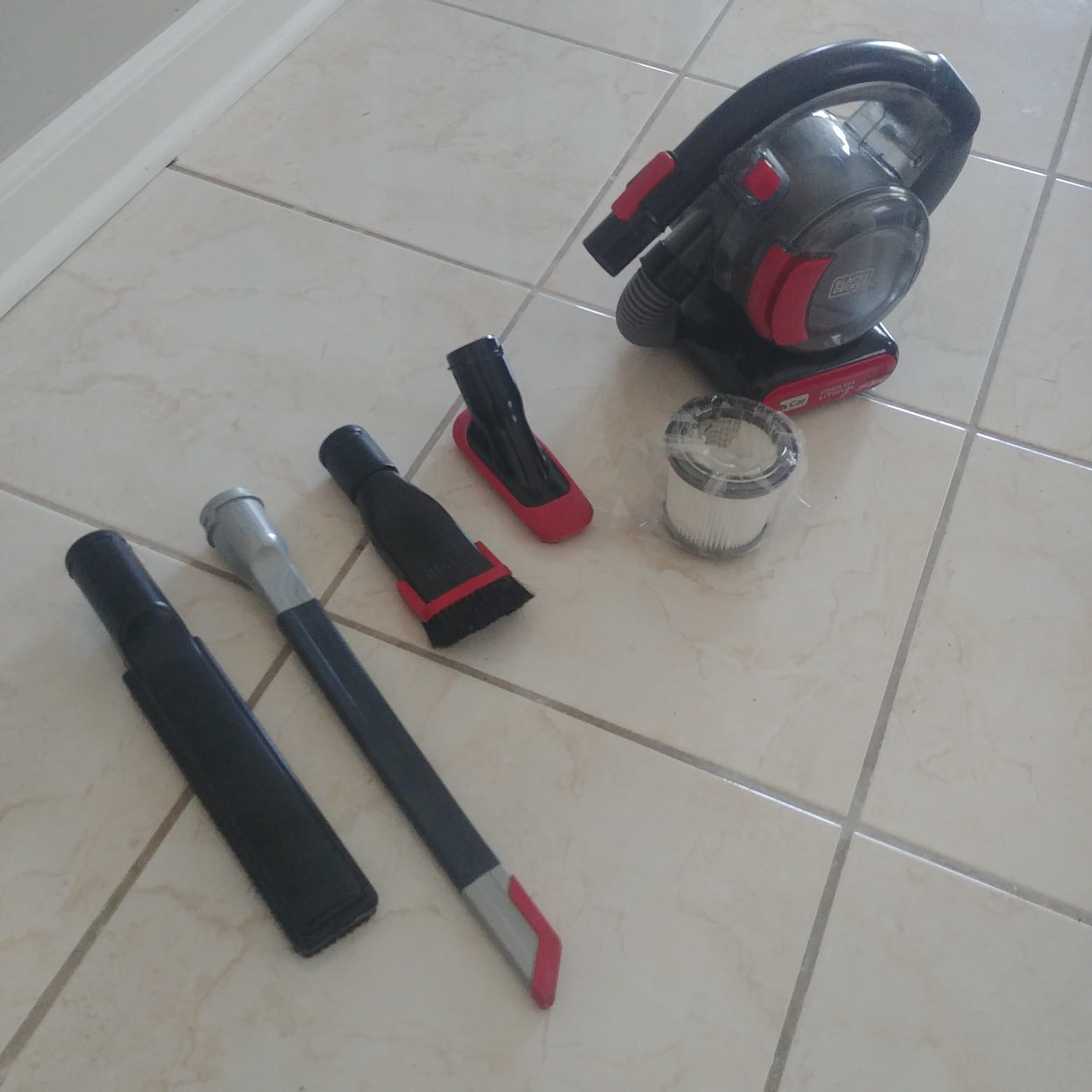 Black + Decker portable vacuum, includes 4 different vacuum heads and a replacement filter.