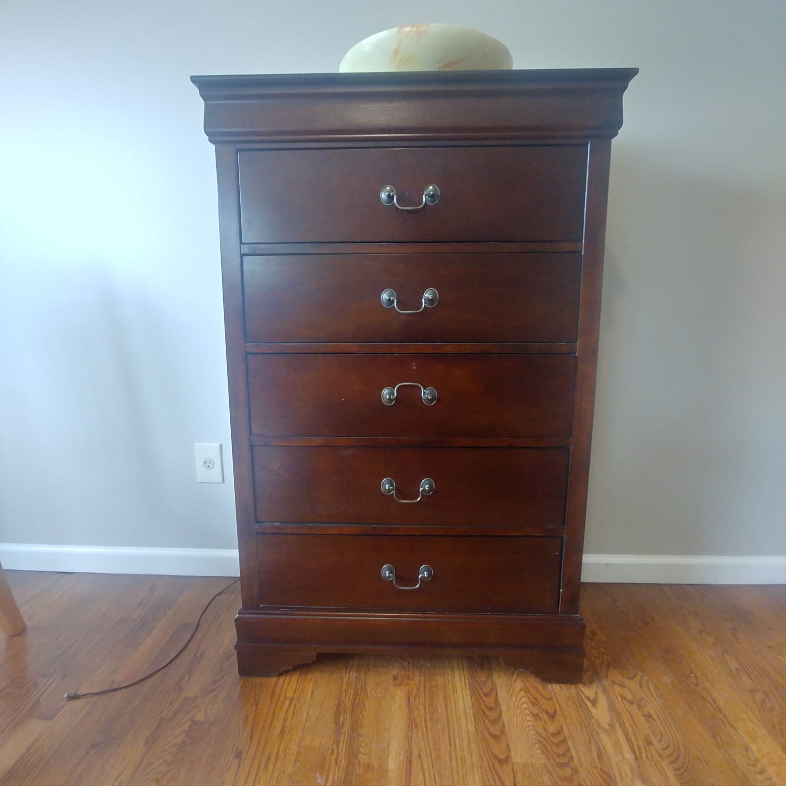 Standing dresser with 5 drawers, part of the same furniture set as the bed.